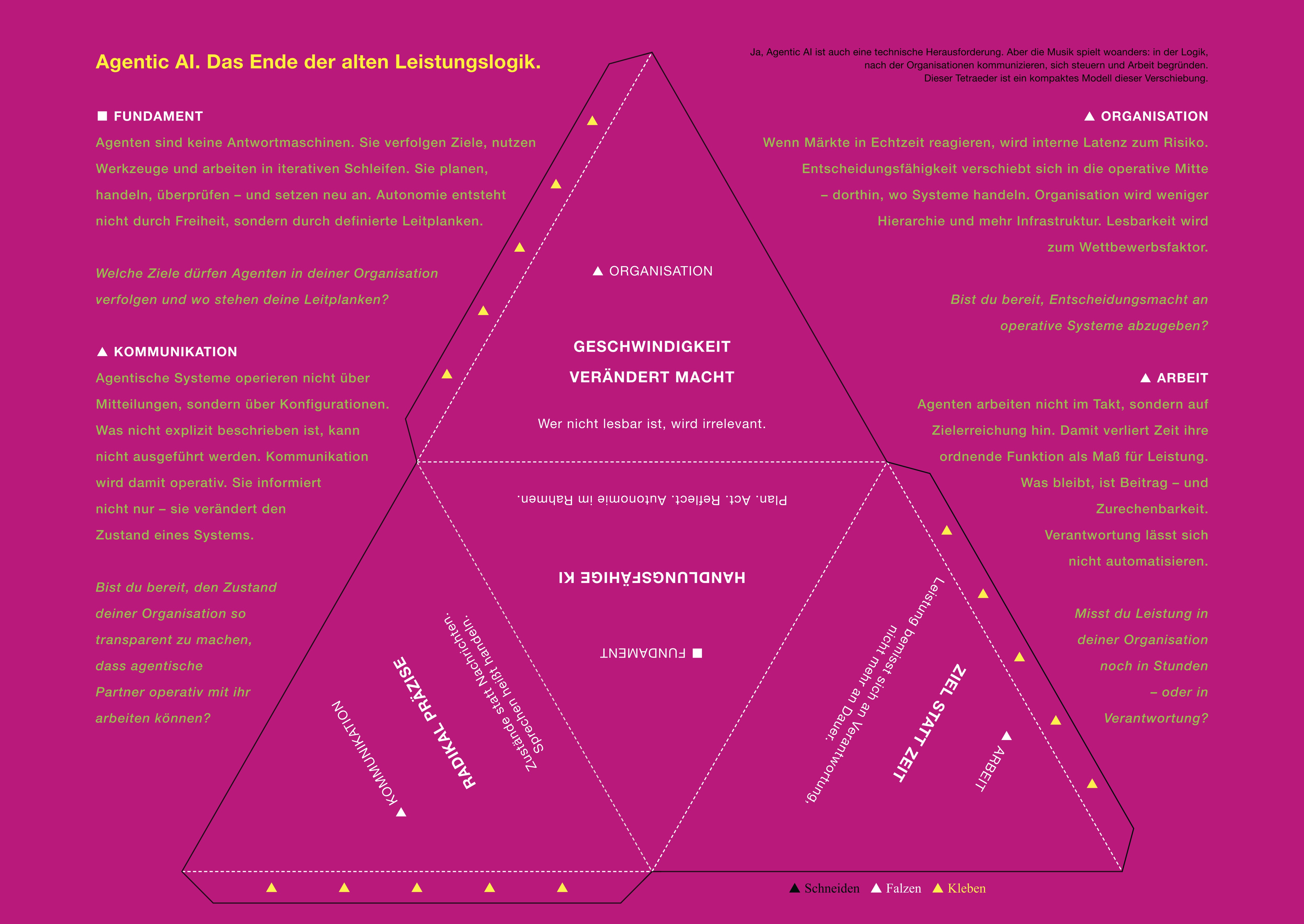Wie immer frei zum Download: In jedem "The Elephant" Journal ist die Mittelseite zum Herausnehmen. Dieses Mal ein Tetraeder zum Ausschneiden und Falten. Die vier Seiten der Agentic AI für dein Unternehmen. Hier herunterladen, auf A3 ausdrucken und auf geht's!